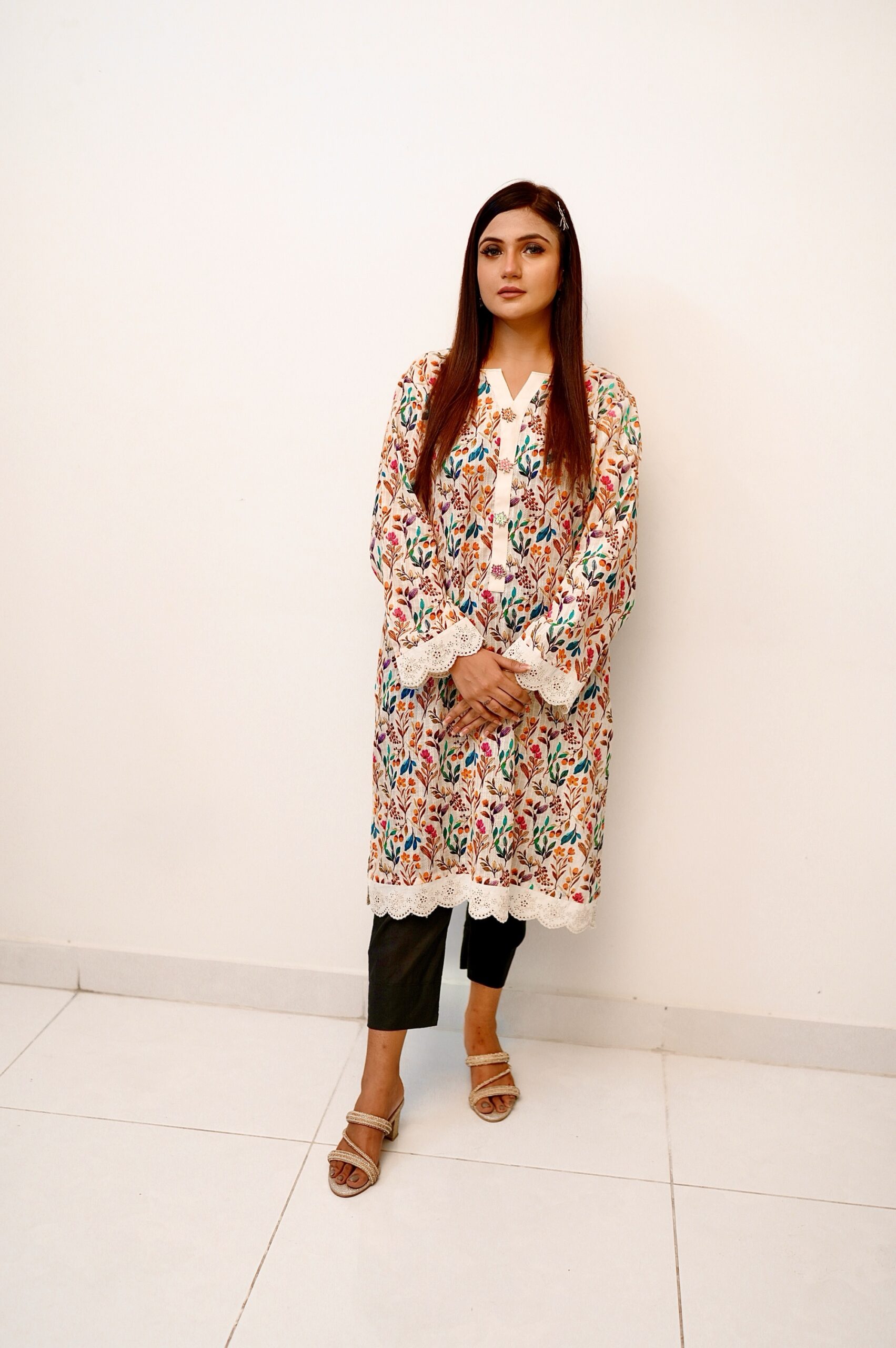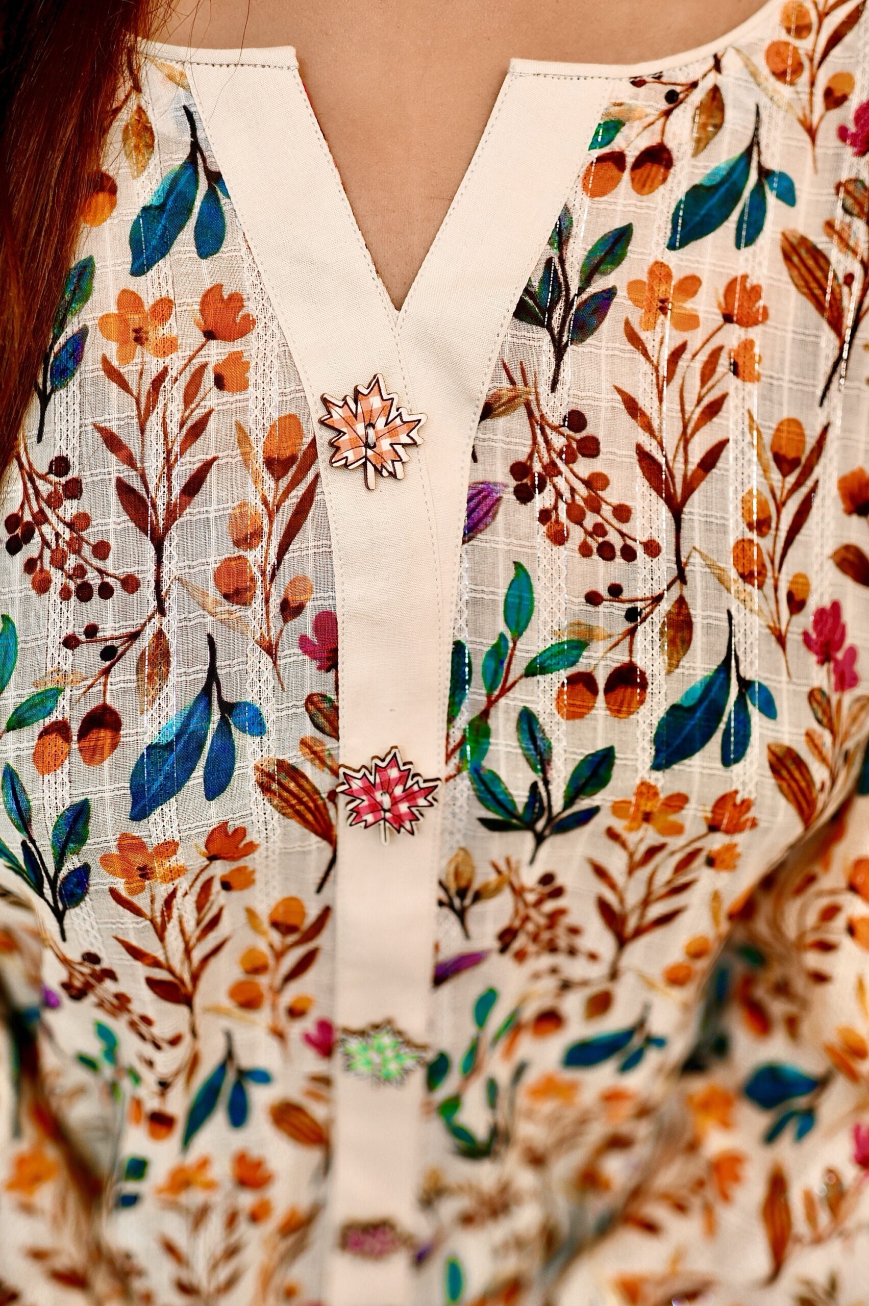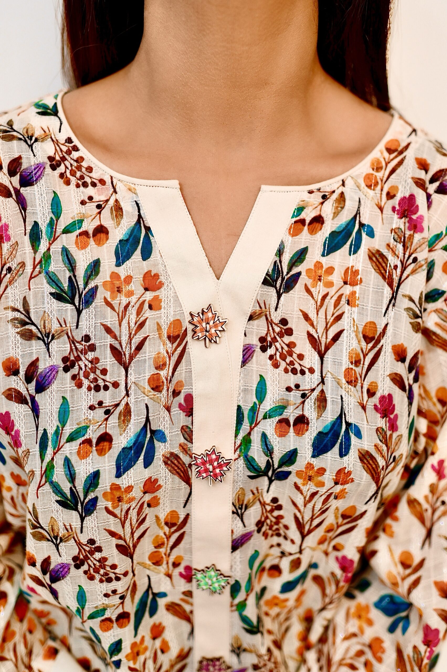 A vibrant colours leafy print dorya lawn shirt features shiny chikankari cutwork lace on daaman and sleeves. The neckline is embellished with Laser cut wooden Buttons.